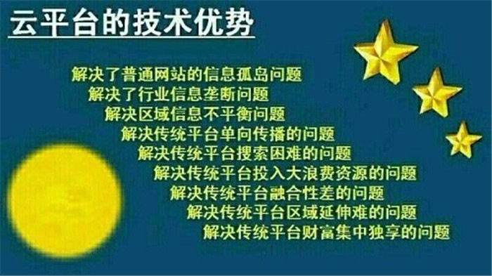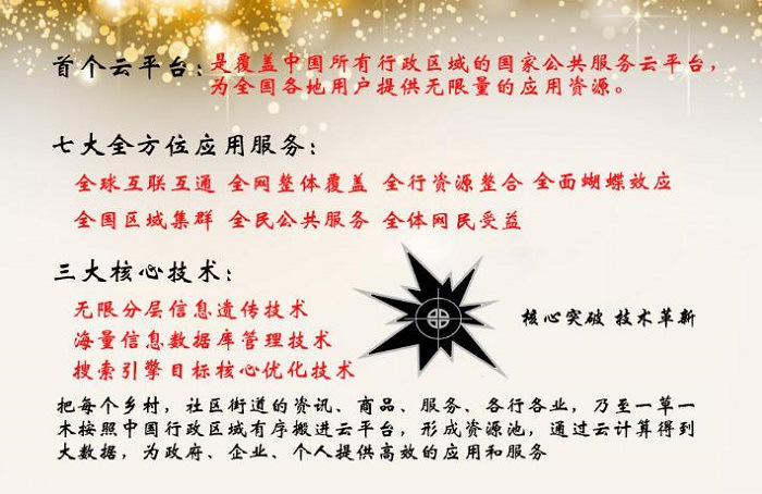 首个云平台用云计算的思维和方法来解决更深层次的社会问题将全球业界一直将云计算停留在技术开发层面提升到了应用管理的战略层面,把人们从二维空间文明推向高维度空间文明(比如自古至今人们都认为天堂很美好,为什么?因为高维度文明要高于低维度文明)。首个云平台为了“众生平等、自由生活”打造了一个信息化技术构建的高维度空间,来解决在我们生存的二维世界里存在的种种弊端,让信息和数据发挥更大的社会价值!